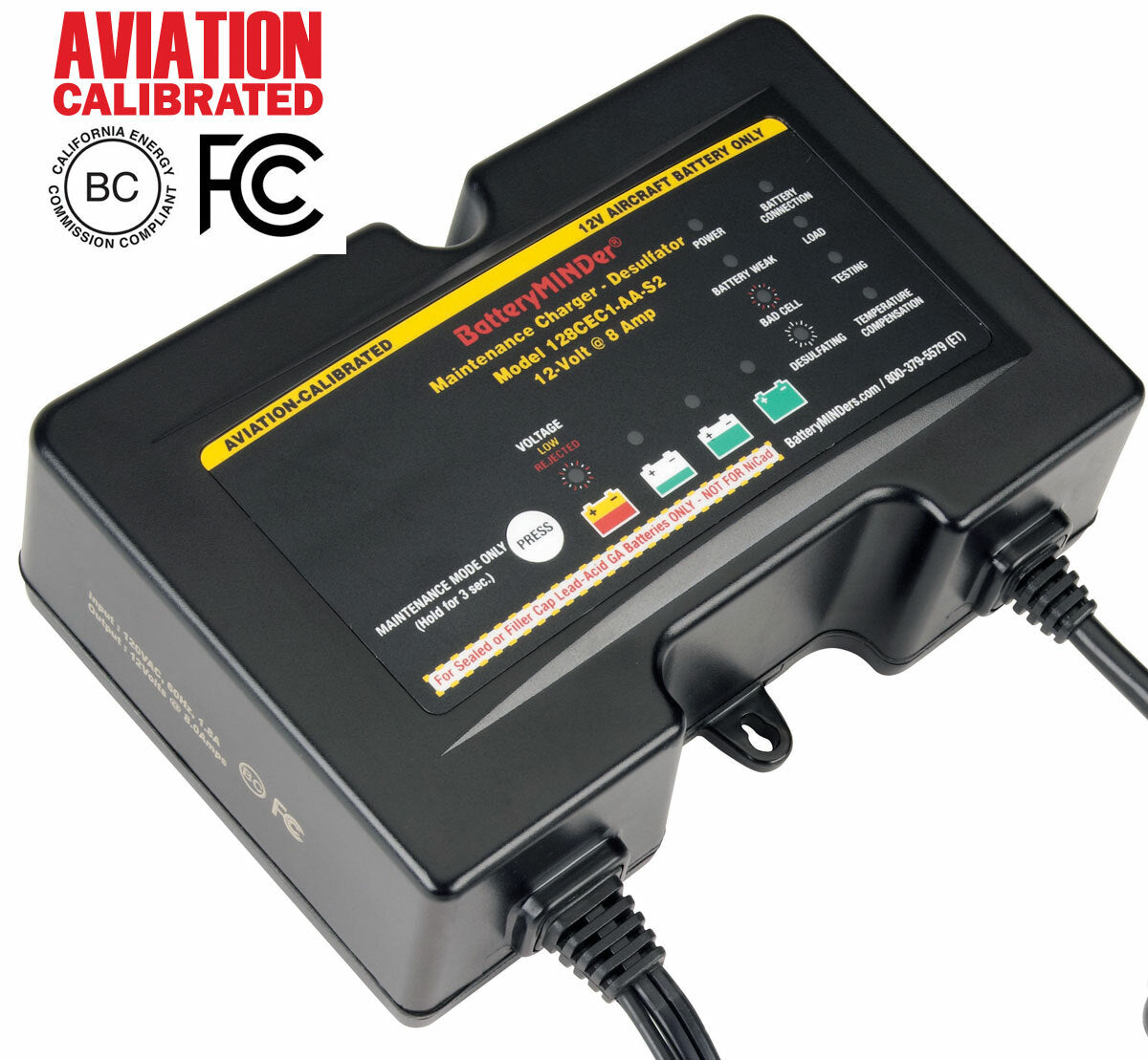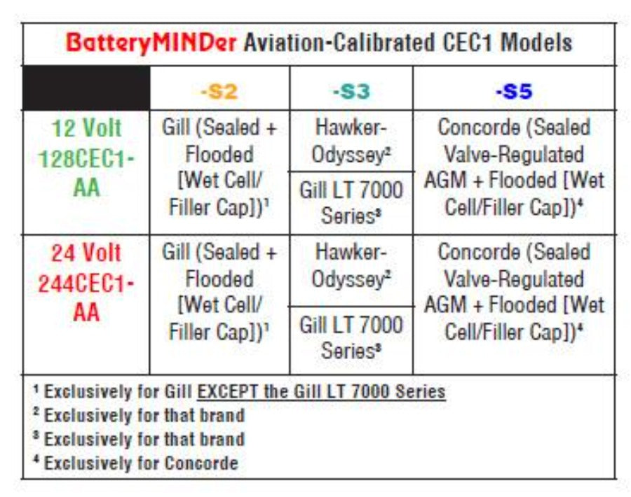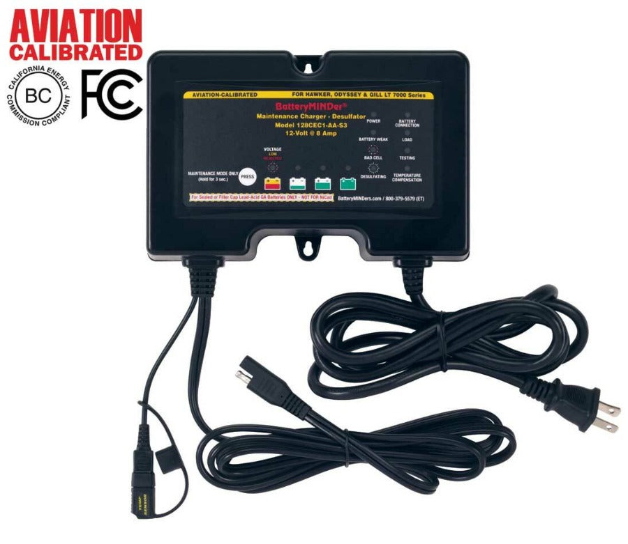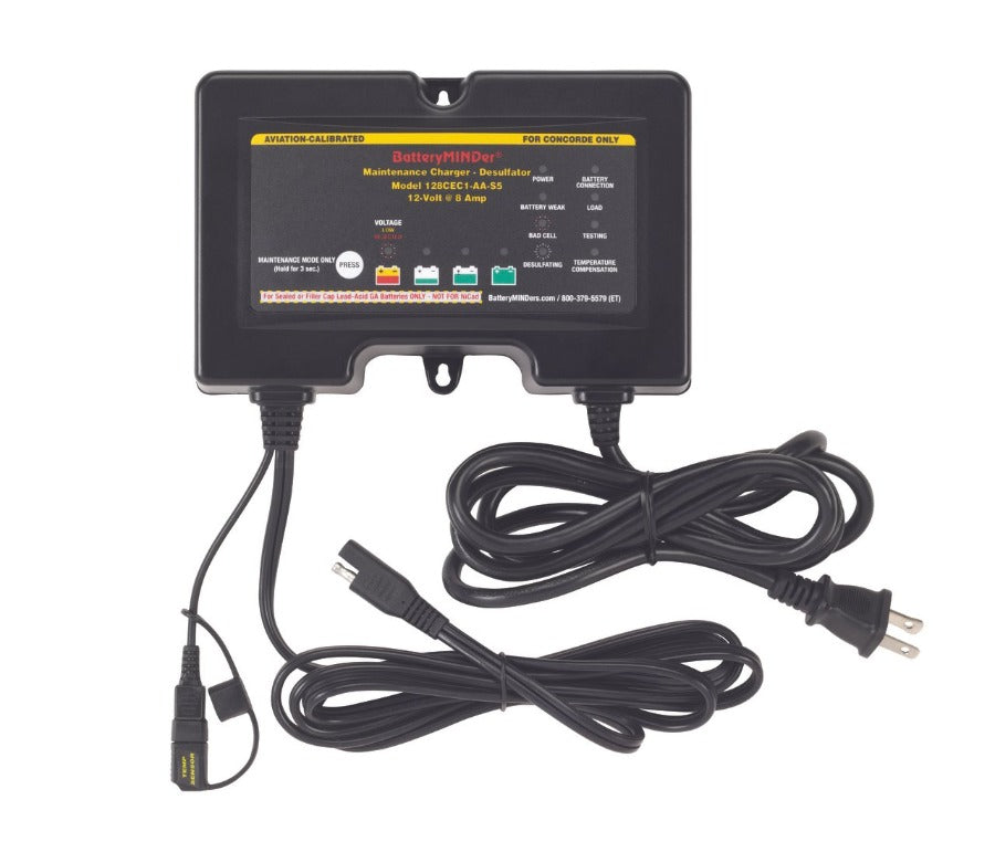 These chargers-maintainers-desulfators are designed for all size and type 12-Volt Concorde® Aviation Batteries. If you want the longest possible life and performance from your batteries there is no other product better at doing just this and BatteryMINDer® Guarantees it! In addition to charging and maintaining all 12V Concorde® sealed or wet cell (filler caps) aviation batteries users can now determine the level of charge remaining in their battery, and if weak and in need of replacement, before going bad. Units test for weak/dead cells and will recover weak or severely discharged batteries that other chargers would reject. Known as the CEC1-AA series they feature advancements in easy to understand battery analysis and condition not previously available in any other single model. Their high efficiency design, controlled by industrially-rated microprocessors, allow continuous operation (24 hrs./day) for less than $0.43/month*. Temperature sensors prevents over/under charging from freezing to 130-F.