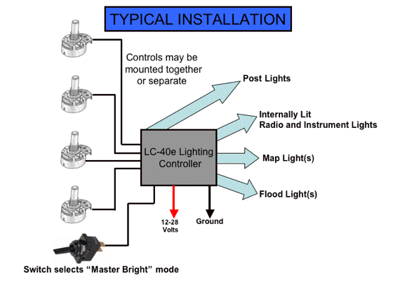 The LC-40e Lighting Controllers are Low Cost Four-Channel Light Dimming Systems for Experimental Aircraft The LC-40e is a low cost four channel light dimming system. Compact and modern, it features extra control knob sensitivity at dim end of the lighting range where it is needed most. It is microcontroller controlled and has continuous over voltage, current limit and fault protection. Each channel can handle 1.5 ampsLC-40e The LC-40e comes in an anodized brushed aluminum chassis. Potentiometers included. |