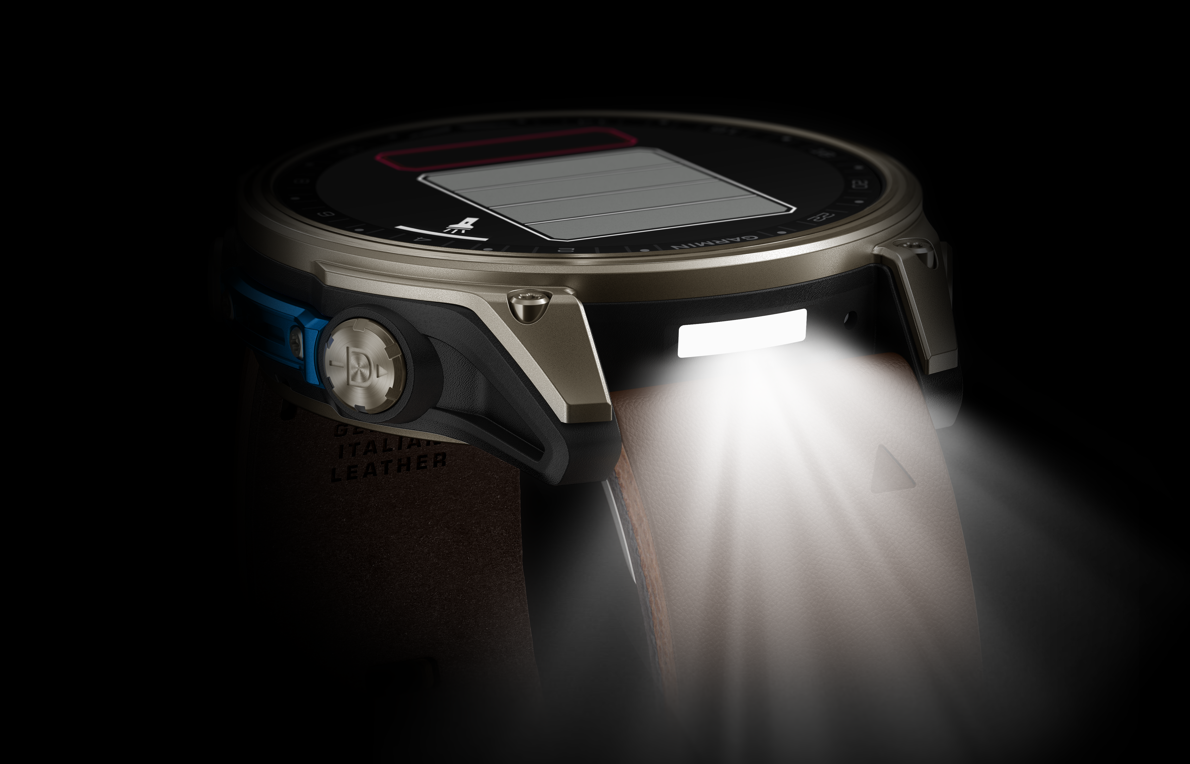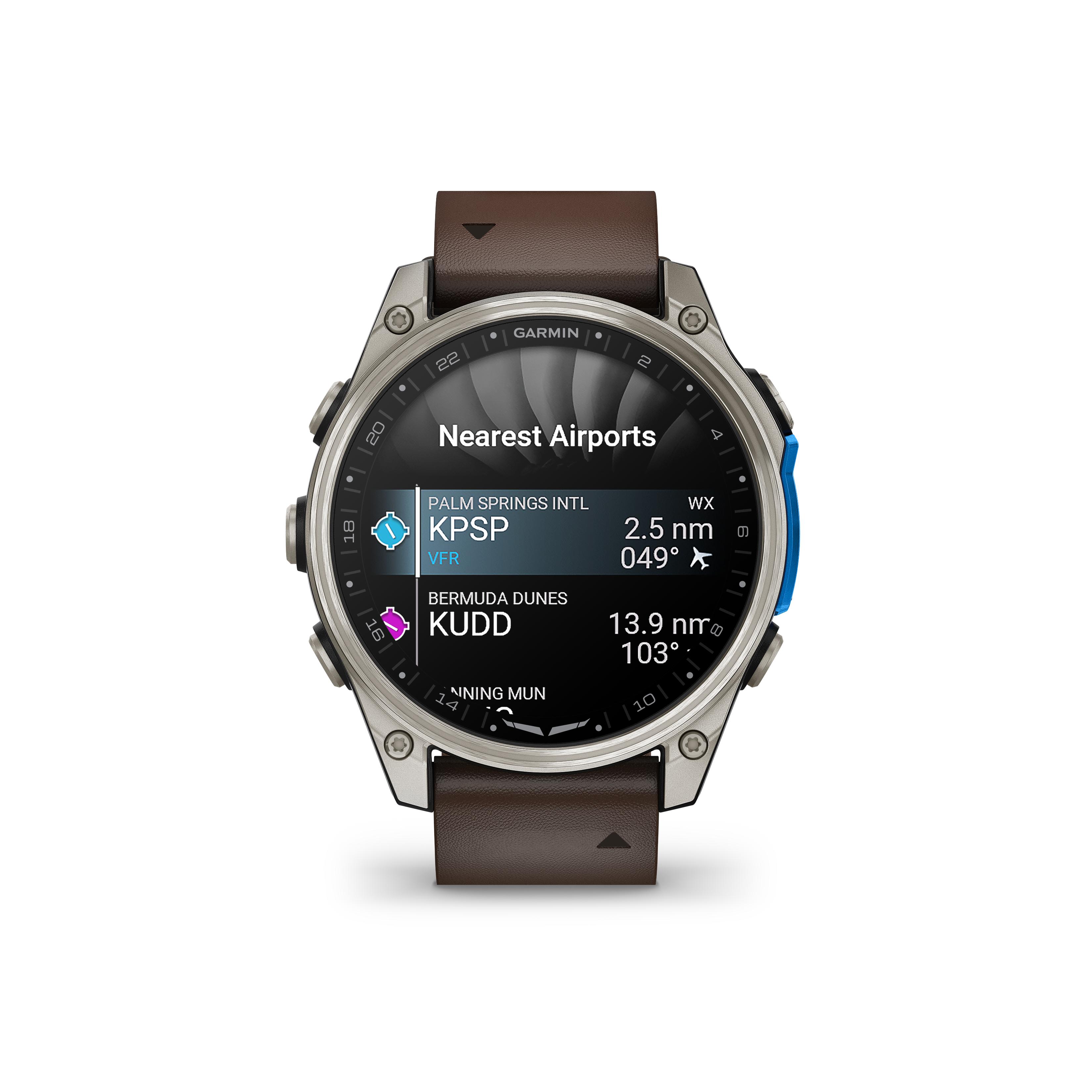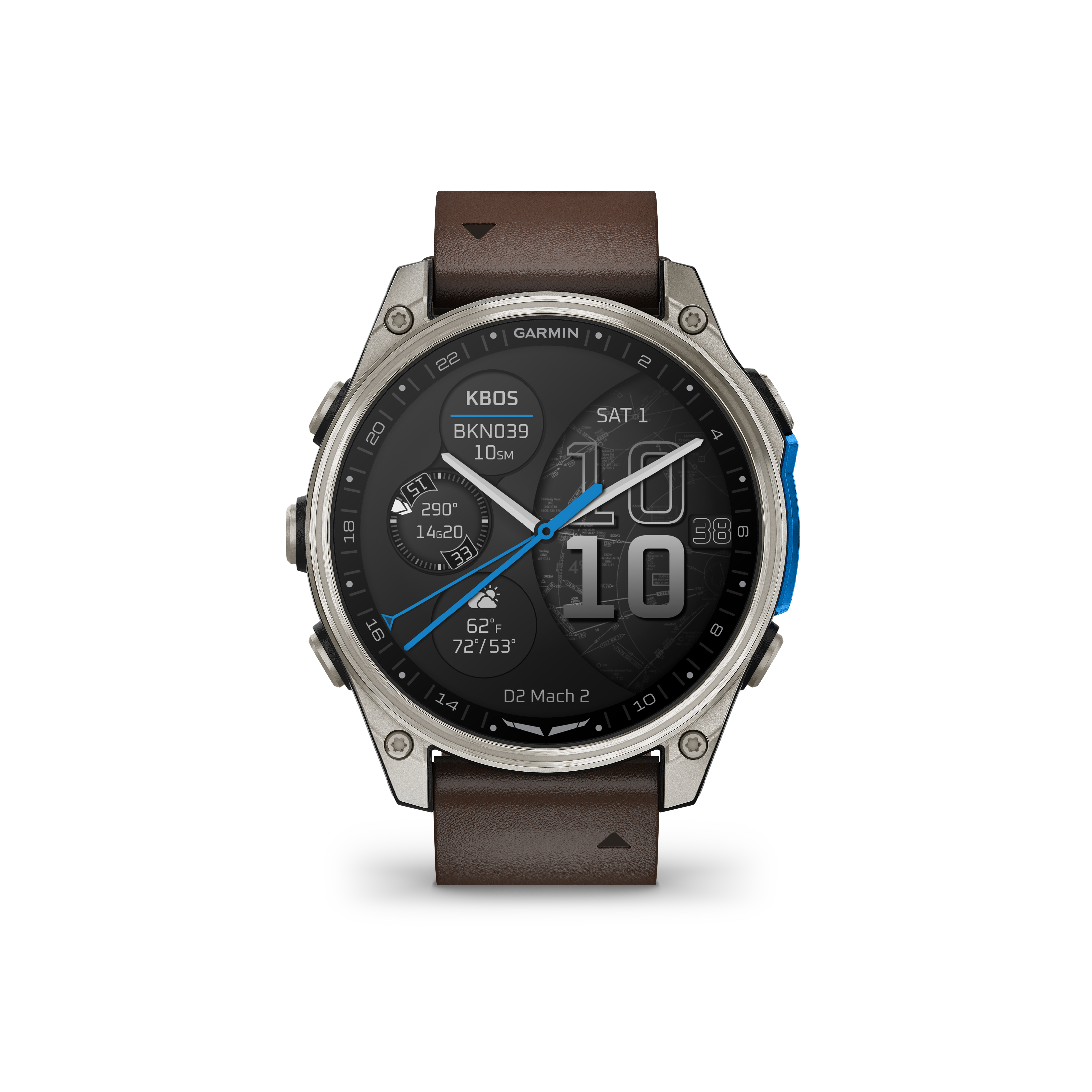 D2™ Mach 2 watch is the most highly evolved Garmin aviator smartwatch to date. It combines classic aviation styling with a durable titanium bezel, sapphire lens, bright 1.4" AMOLED touchscreen display, advanced flight mapping and powerful built-in LED flashlight. D2 Mach 2 has convenient tools for every phase of flight, including an on-device aeronautical database, HSI, and Direct-to navigation. Access NEXRAD, METARs and TAFs — plus set personal minimums to stay ahead of the weather (when paired with your smartphone). The built-in speaker and microphone let you make and take calls from your wrist when your watch is paired with your smartphone. Use voice commands to get METAR information, start a flight, select a destination airport and more. Advanced health and fitness features help keep you on top of your game with strength training plans, daily suggested workouts and monitoring of heart rate, respiration, stress, sleep and more (data presented is intended to be a close estimation of metrics tracked). With up to 14 days of battery life in smartwatch mode, D2 Mach 2 is powered for life on the go.