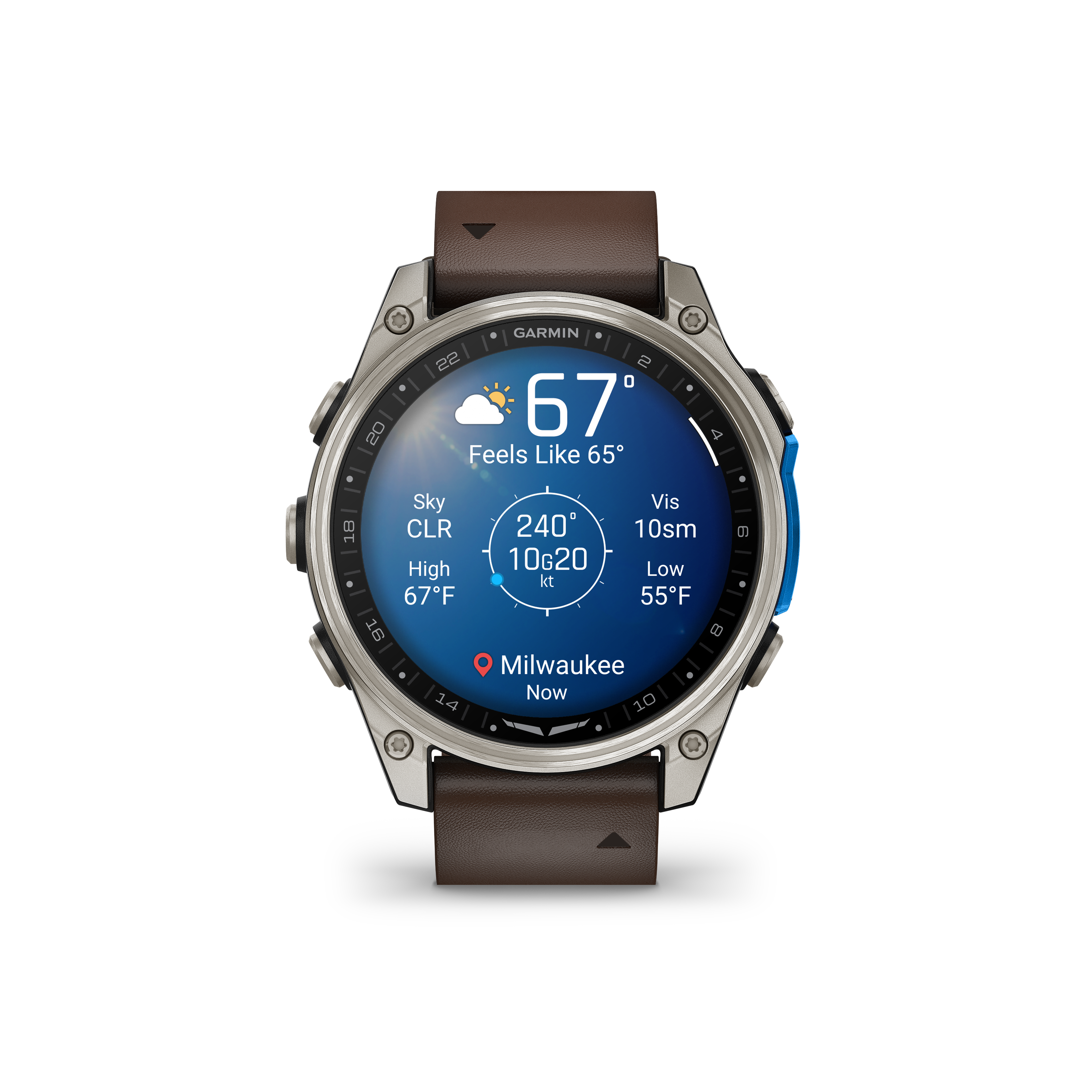 · Premium GPS aviator smartwatch features a bright 1.4" AMOLED touchscreen display with scratch-resistant sapphire lens and durable 47 mm titanium bezel; includes Oxford brown leather and silicone QuickFit® watch bands
