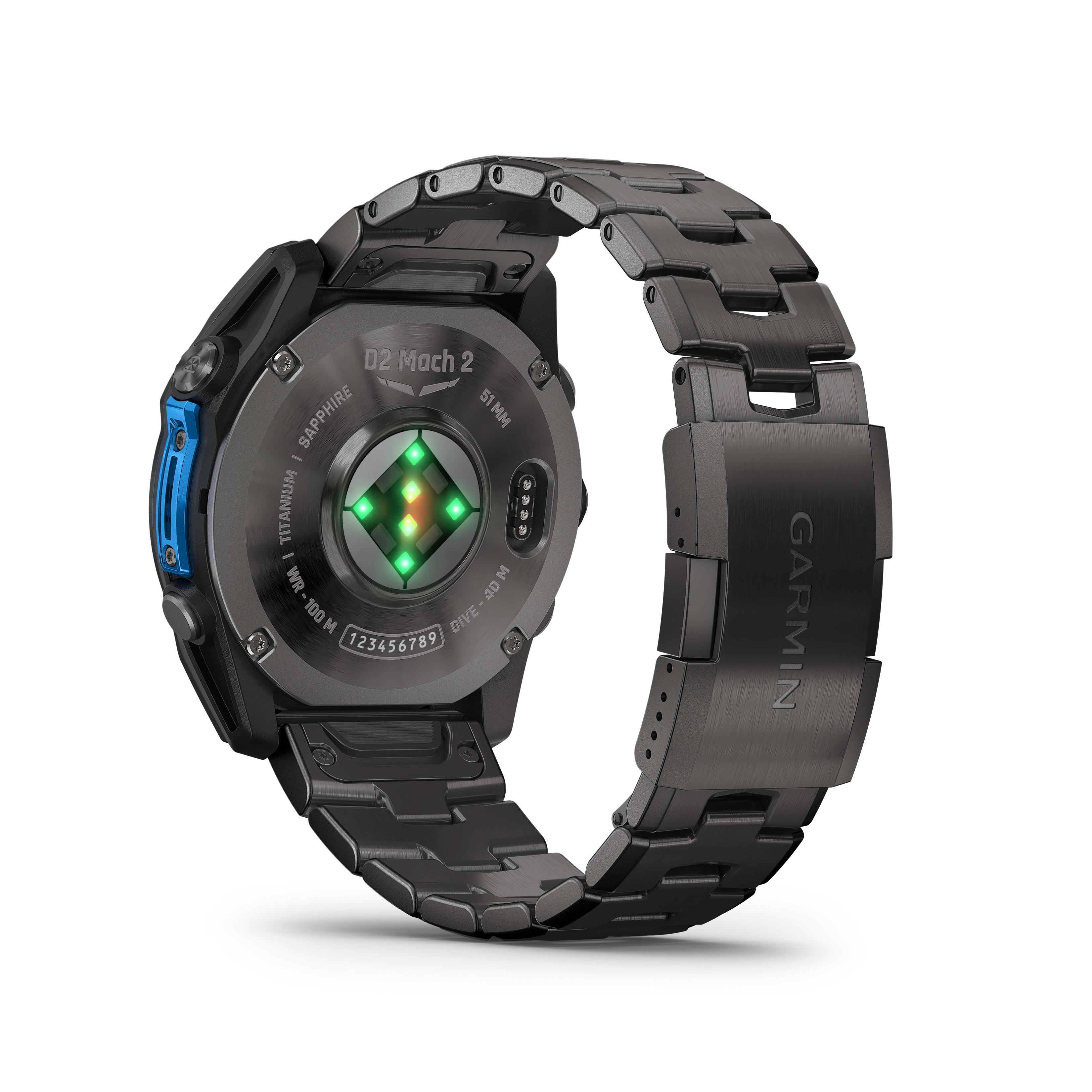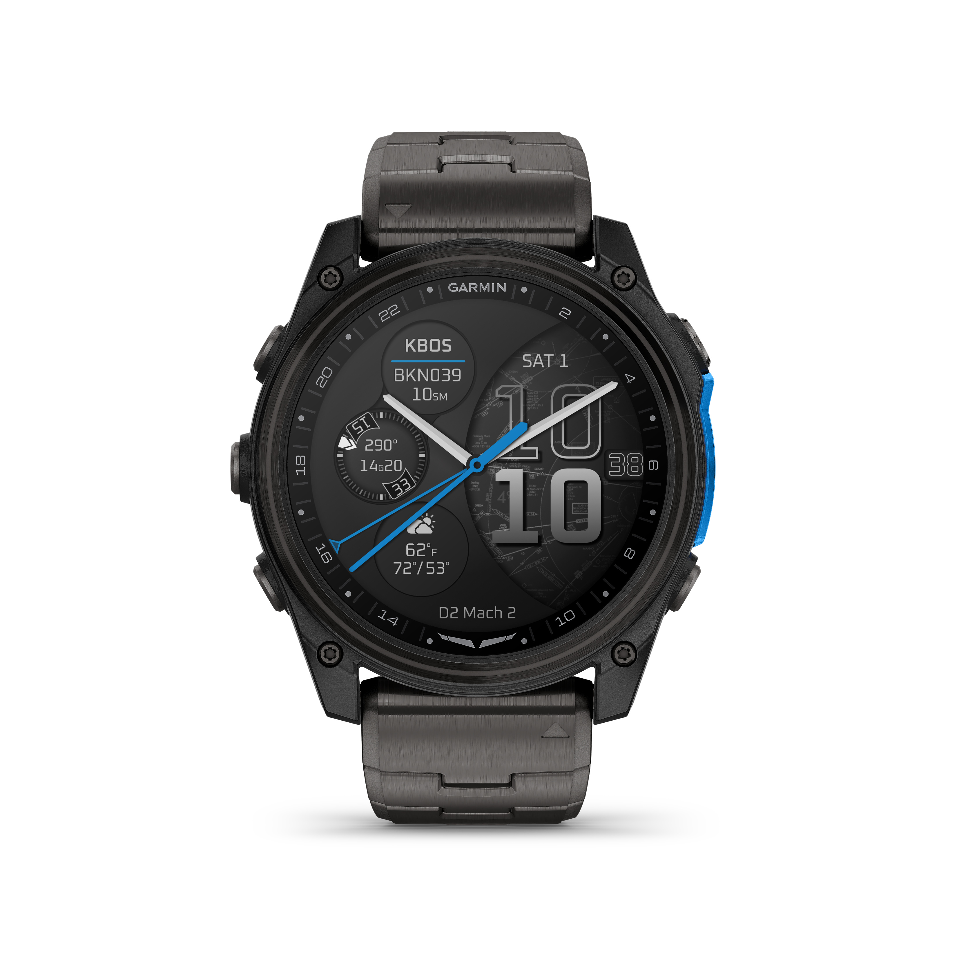 D2™ Mach 2 watch is the most highly evolved Garmin aviator smartwatch to date. It combines classic aviation styling with a durable DLC-coated titanium bezel, sapphire lens, bright 1.4" AMOLED touchscreen display, advanced flight mapping and powerful built-in LED flashlight. D2 Mach 2 has convenient tools for every phase of flight, including an on-device aeronautical database, HSI and Direct-to navigation. Access NEXRAD, METARs and TAFs — plus set personal minimums to stay ahead of the weather (when paired with your smartphone). The built-in speaker and microphone let you make and take calls from your wrist when your watch is paired with your smartphone. Use voice commands to get METAR information, start a flight, select a destination airport and more. Advanced health and fitness features help keep you on top of your game with strength training plans, daily suggested workouts and monitoring of heart rate, respiration, stress, sleep and more (data presented is intended to be a close estimation of metrics tracked). With up to 26 days of battery life in smartwatch mode, D2 Mach 2 is powered for life on the go.