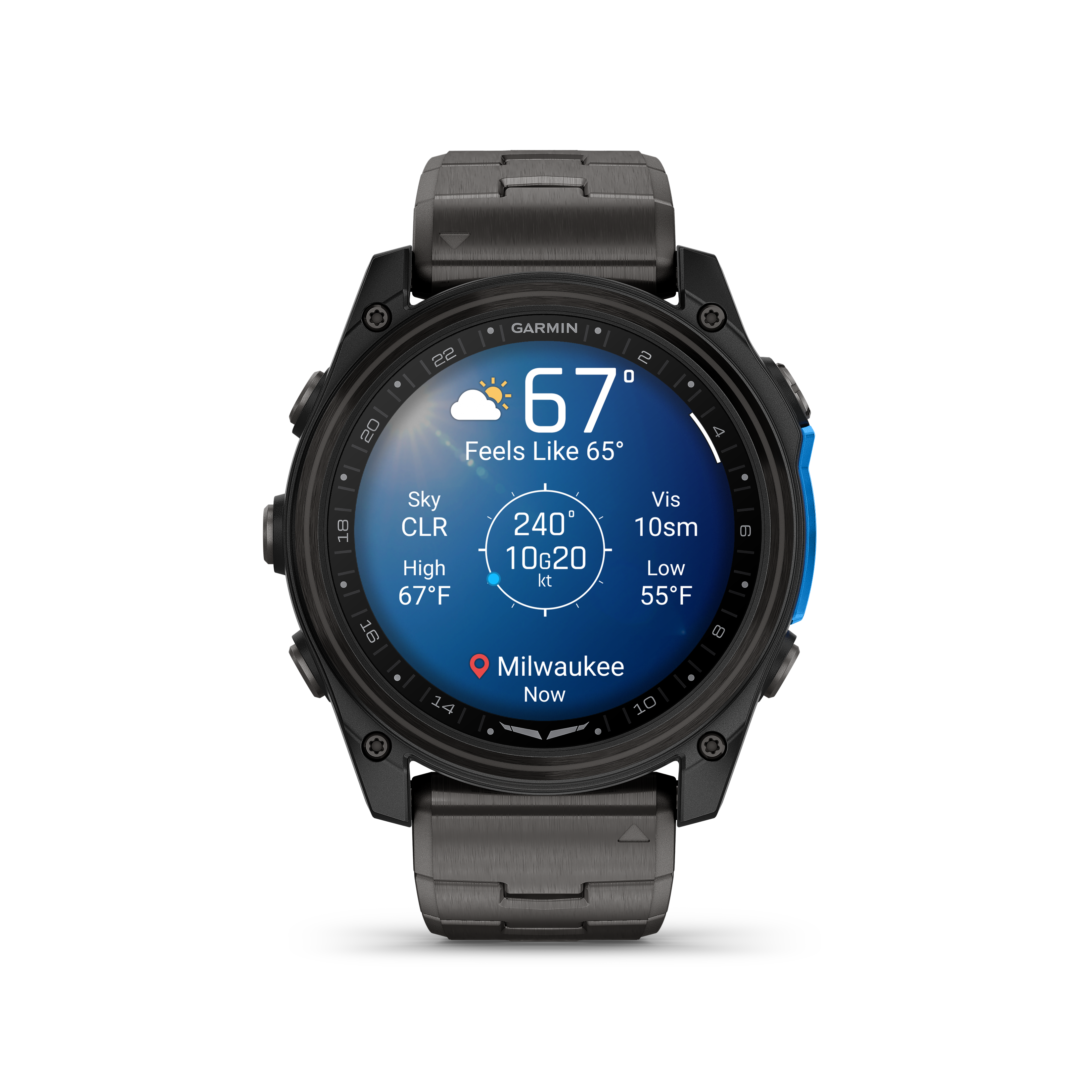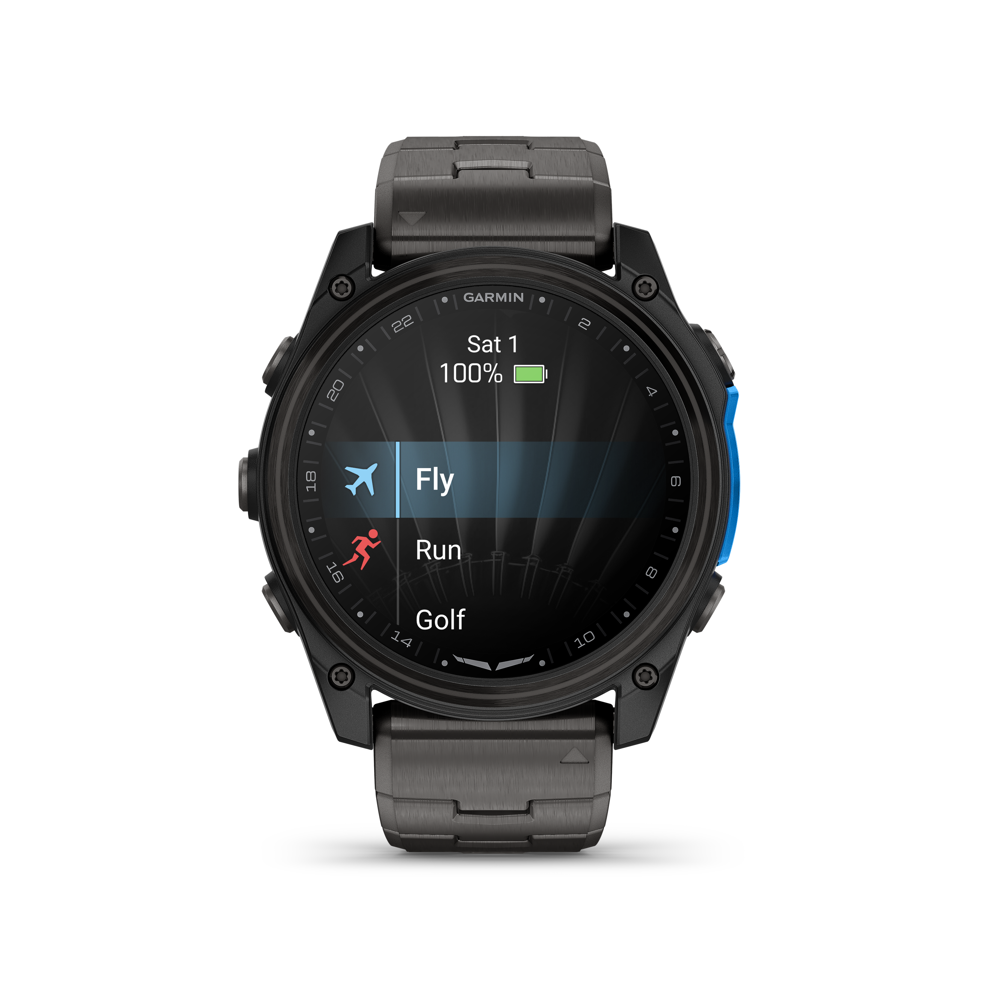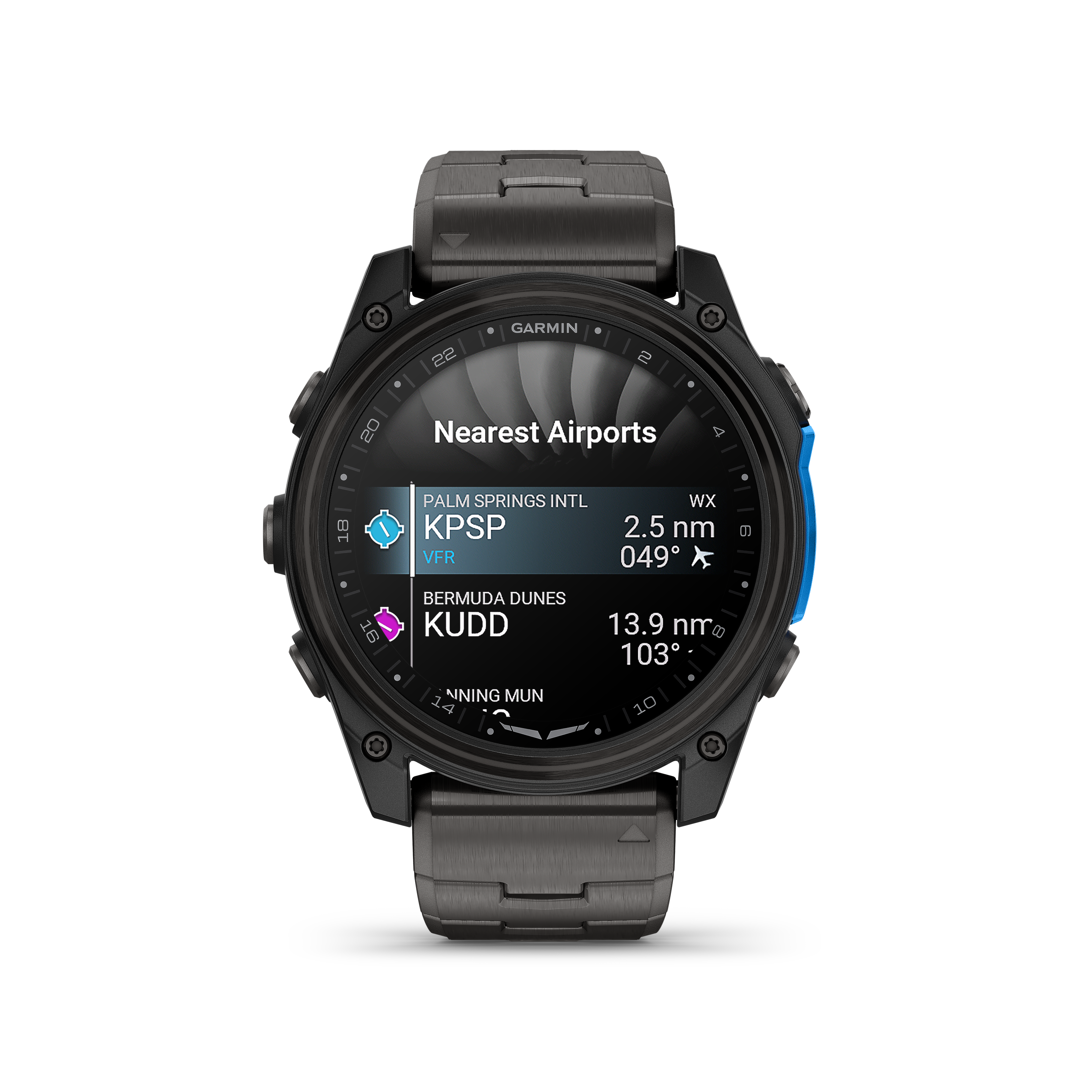 · Premium GPS aviator smartwatch features a bright 1.4" AMOLED touchscreen display with scratch-resistant sapphire lens and durable 51 mm DLC-coated titanium bezel; includes carbon gray titanium bracelet and silicone QuickFit® watch band