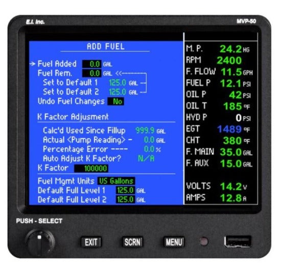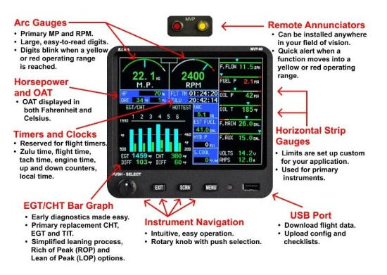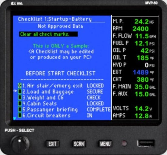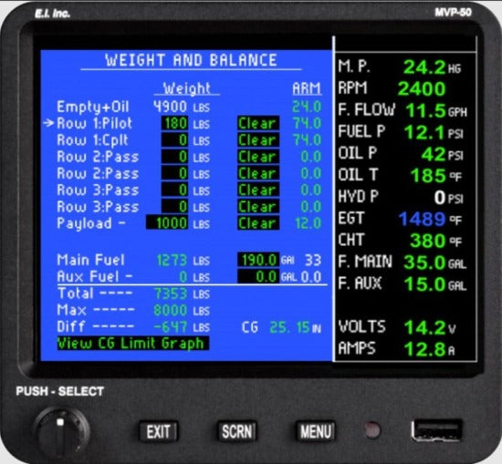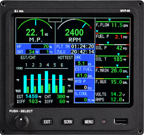 Without question, the MVP-50P is the industry’s finest engine analyzer and systems monitor, hands down. EI has redefined what an engine analyzer should be with the full color, glass-paneled, completely customizable MVP-50P. The MVP-50P allows pilots to accurately monitor dozens of engine and system parameters, program redline limits, setup custom inputs, create interactive checklists, store general flight information, build flight plans, record and review pertinent data from every flight, and so much more. The MVP-50P has been designed with the same thoughtful engineering that goes into every EI product, so even though the MVP-50P is by far the most powerful system in the industry, it is sure to be one of the easiest systems to use in your cockpit.