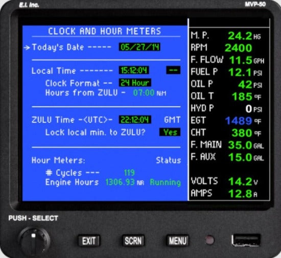 - Displays the current date, local time, zulu time, tach time, and engine hours