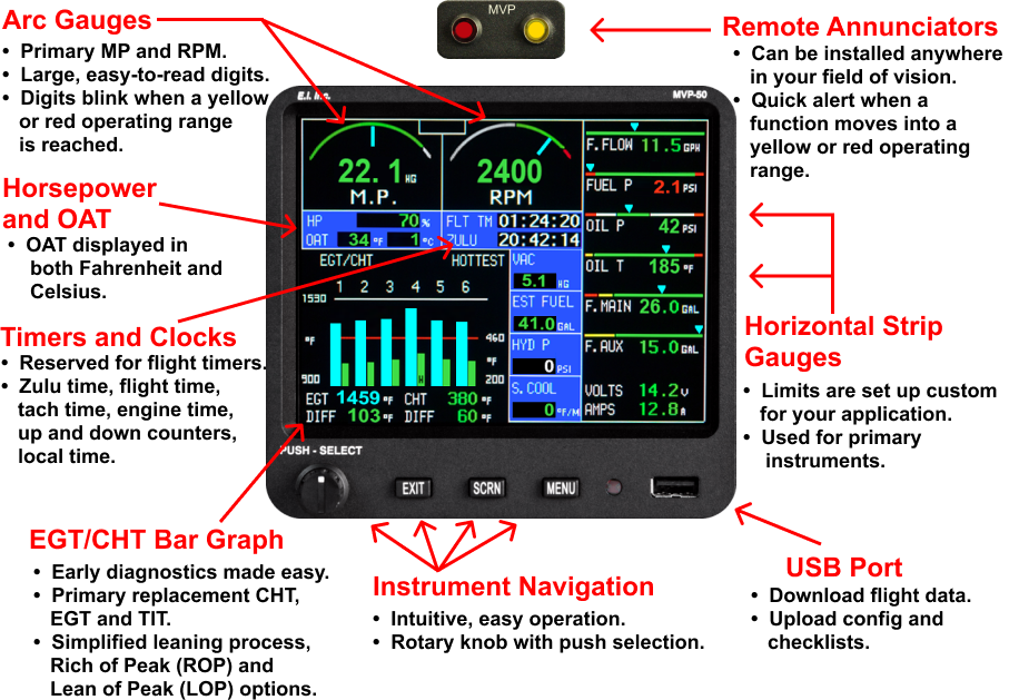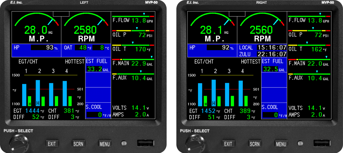Without question, the MVP-50P is the industry’s finest engine analyzer and systems monitor, hands down. EI has redefined what an engine analyzer should be with the full color, glass-paneled, completely customizable MVP-50P. The MVP-50P allows pilots to accurately monitor dozens of engine and system parameters, program redline limits, setup custom inputs, create interactive checklists, store general flight information, build flight plans, record and review pertinent data from every flight, and so much more. The MVP-50P has been designed with the same thoughtful engineering that goes into every EI product, so even though the MVP-50P is by far the most powerful system in the industry, it is sure to be one of the easiest systems to use in your cockpit.
